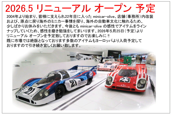 ミニカー オリーブをご愛好いただきありがとうございます。 現在、EC プラットフォーム( Amazon、Yahoo、楽天 ) での販売を一時休止させていただいております。 休止前在庫につきましては、5月25日より(予定)再度 販売を予定しております、また国内外よりの新しい商品も 順次販売を予定しておりますのでお楽しみに! E-mail : info@minicar-olive.com